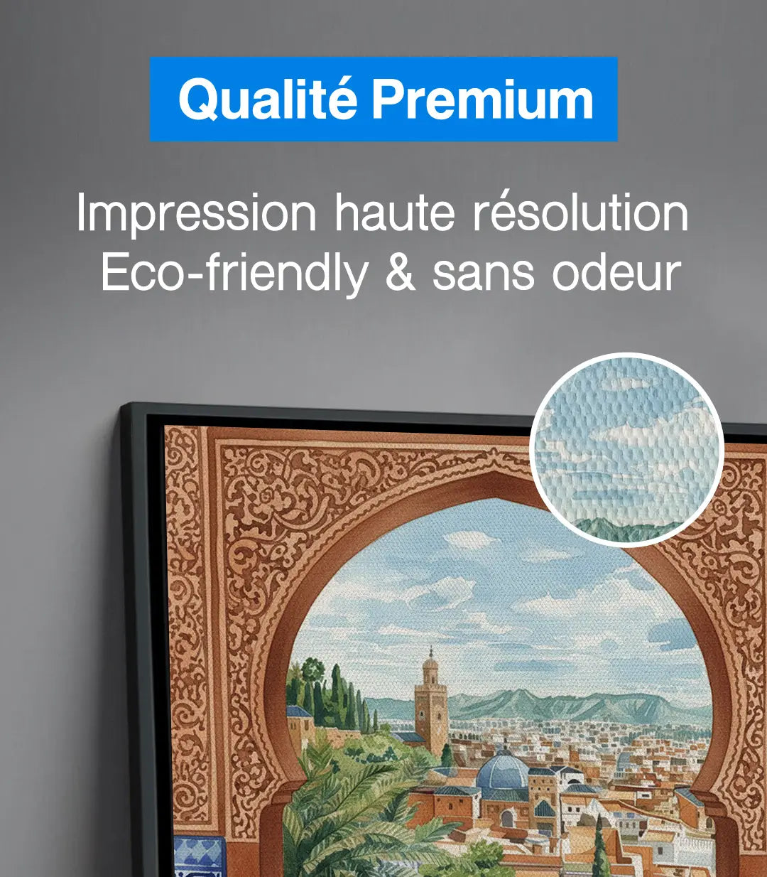 Découvrez nos tableaux exclusifs sur massinart.ma, alliant artisanat et modernité pour sublimer vos espaces. Chaque tableau est conçu à partir d’un châssis de 3 cm et d’une toile canvas artistique en coton (80 %), fabriquée en Allemagne. L’impression est réalisée en haute résolution avec des encres écologiques et sans odeur, garantissant une qualité exceptionnelle.