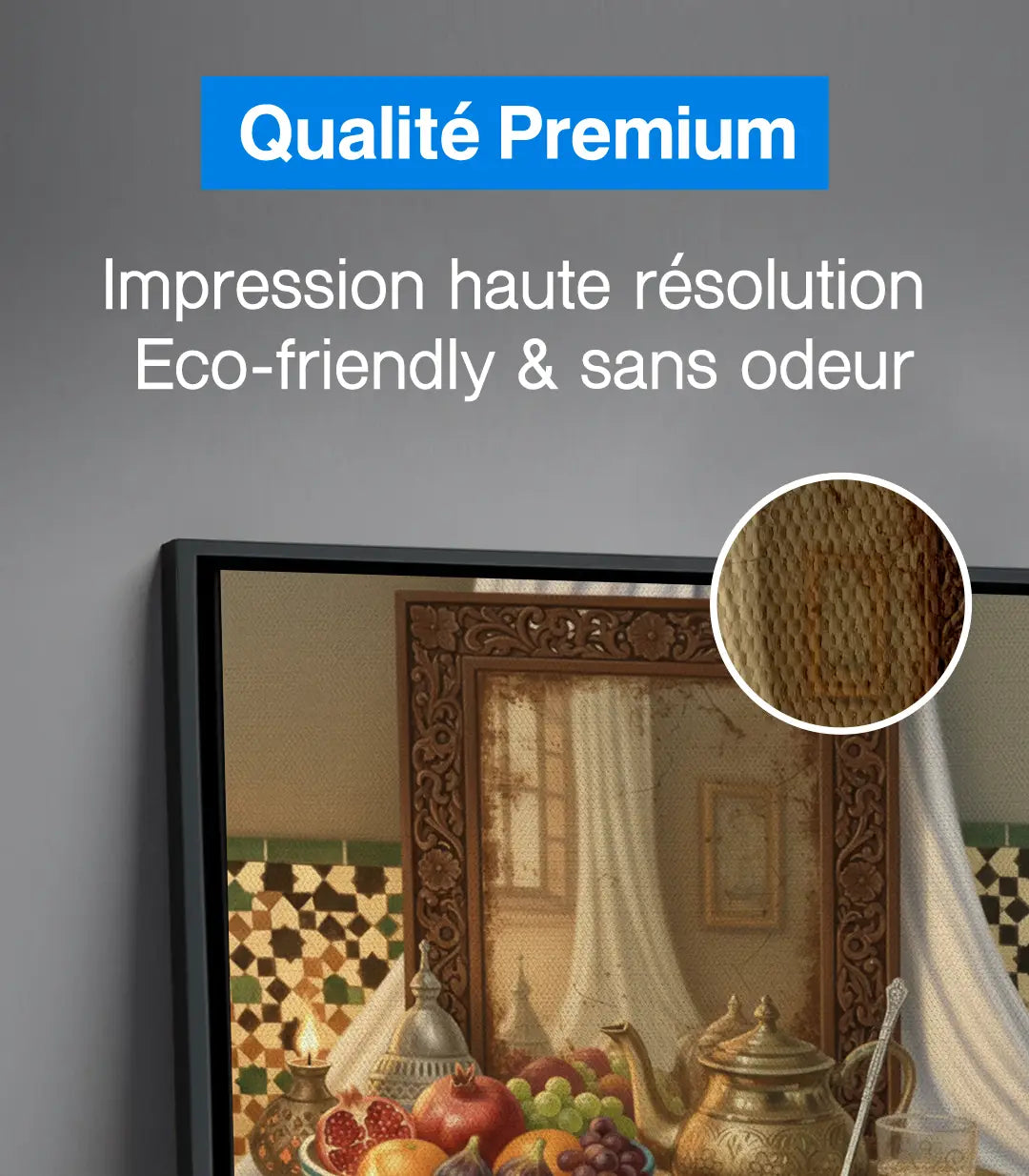 Découvrez nos tableaux exclusifs sur massinart.ma, alliant artisanat et modernité pour sublimer vos espaces. Chaque tableau est conçu à partir d’un châssis de 3 cm et d’une toile canvas artistique en coton (80 %), fabriquée en Allemagne. L’impression est réalisée en haute résolution avec des encres écologiques et sans odeur, garantissant une qualité exceptionnelle.