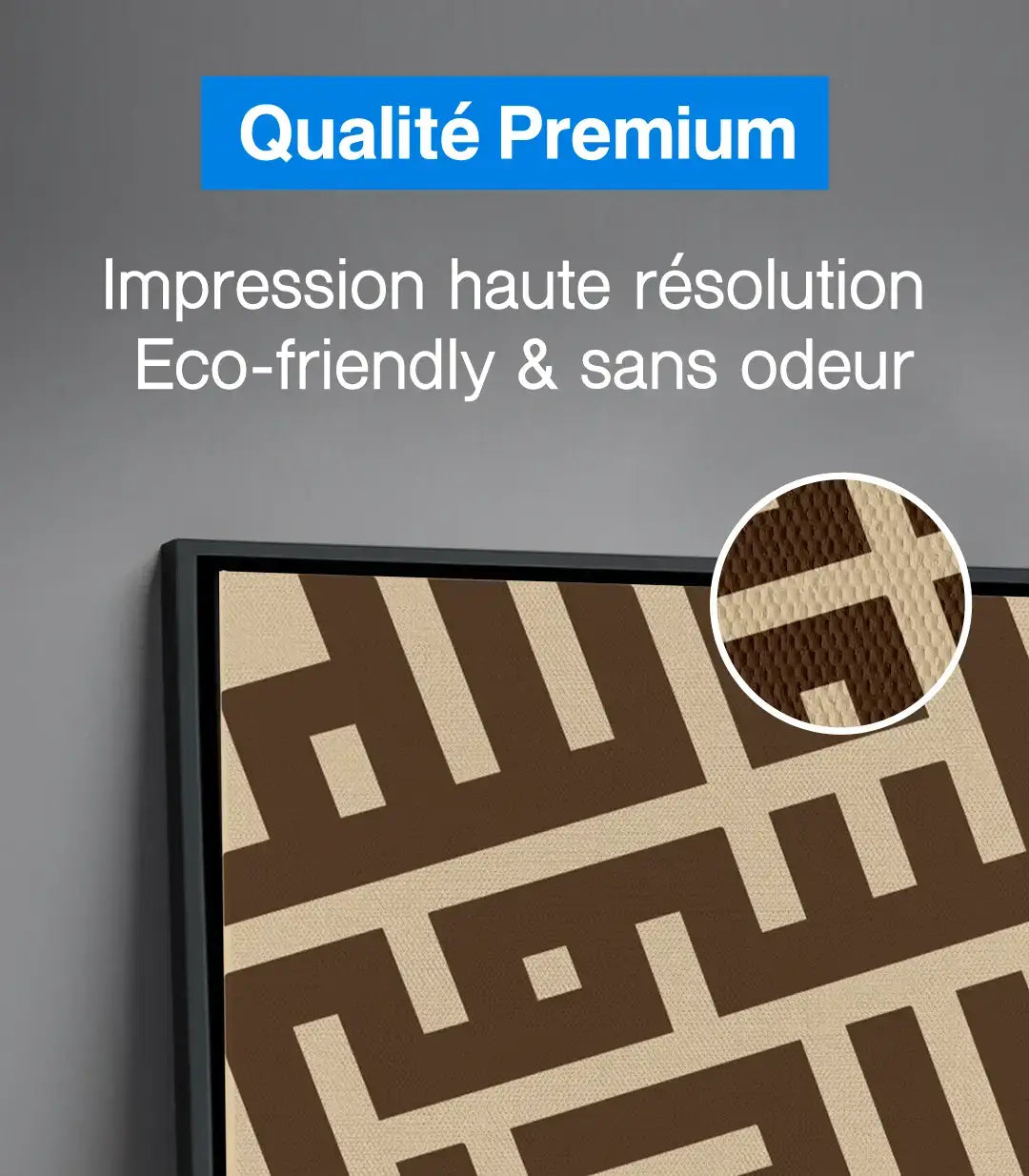 Découvrez nos tableaux exclusifs sur massinart.ma, alliant artisanat et modernité pour sublimer vos espaces. Chaque tableau est conçu à partir d’un châssis de 3 cm et d’une toile canvas artistique en coton (80 %), fabriquée en Allemagne. L’impression est réalisée en haute résolution avec des encres écologiques et sans odeur, garantissant une qualité exceptionnelle.