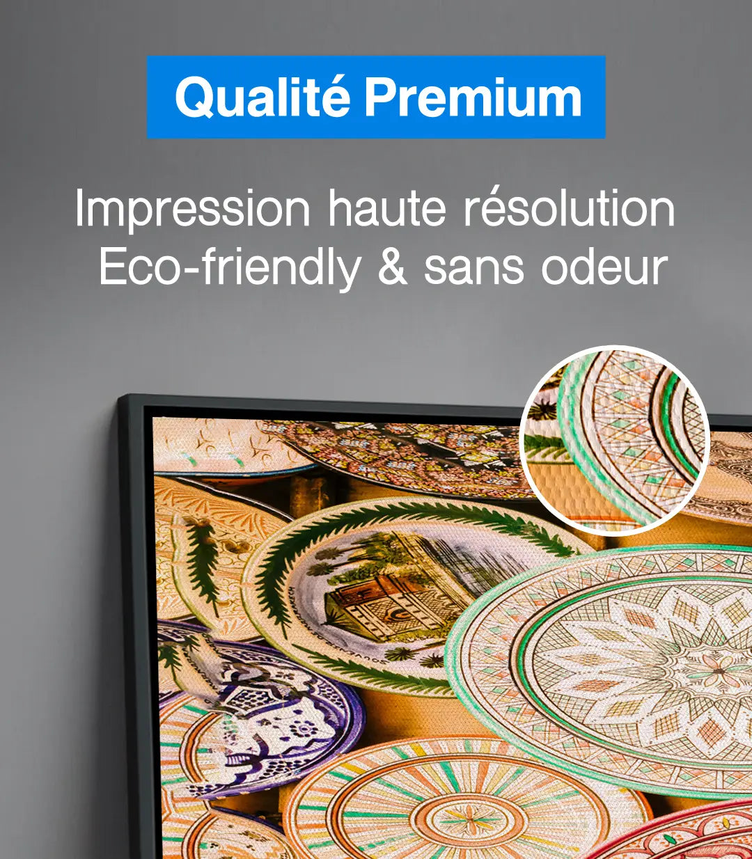 Découvrez nos tableaux exclusifs sur massinart.ma, alliant artisanat et modernité pour sublimer vos espaces. Chaque tableau est conçu à partir d’un châssis de 3 cm et d’une toile canvas artistique en coton (80 %), fabriquée en Allemagne. L’impression est réalisée en haute résolution avec des encres écologiques et sans odeur, garantissant une qualité exceptionnelle.