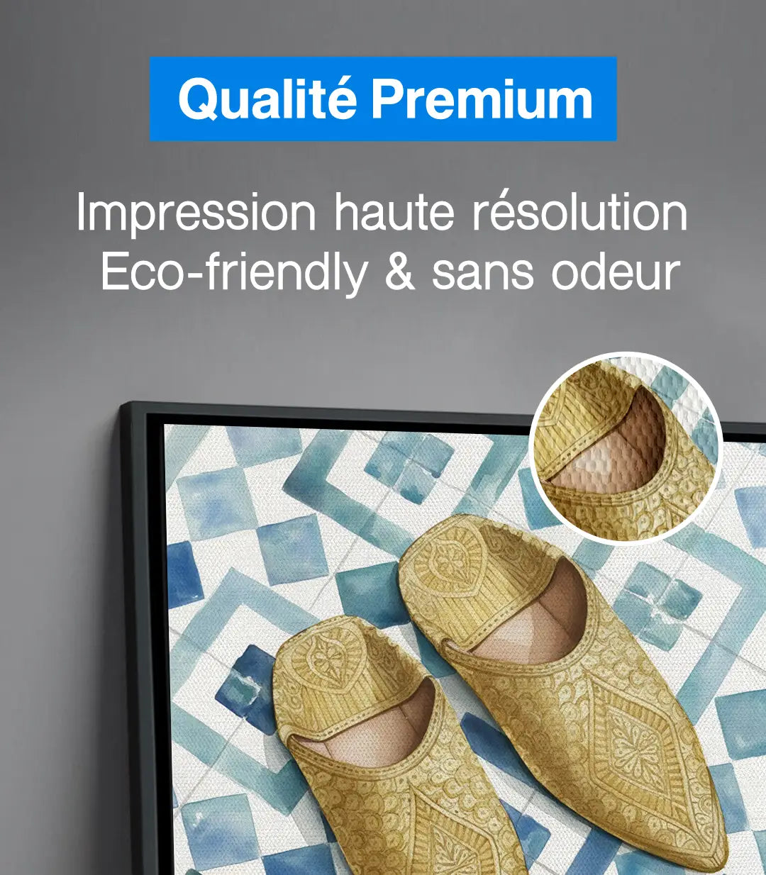 Découvrez nos tableaux exclusifs sur massinart.ma, alliant artisanat et modernité pour sublimer vos espaces. Chaque tableau est conçu à partir d’un châssis de 3 cm et d’une toile canvas artistique en coton (80 %), fabriquée en Allemagne. L’impression est réalisée en haute résolution avec des encres écologiques et sans odeur, garantissant une qualité exceptionnelle.