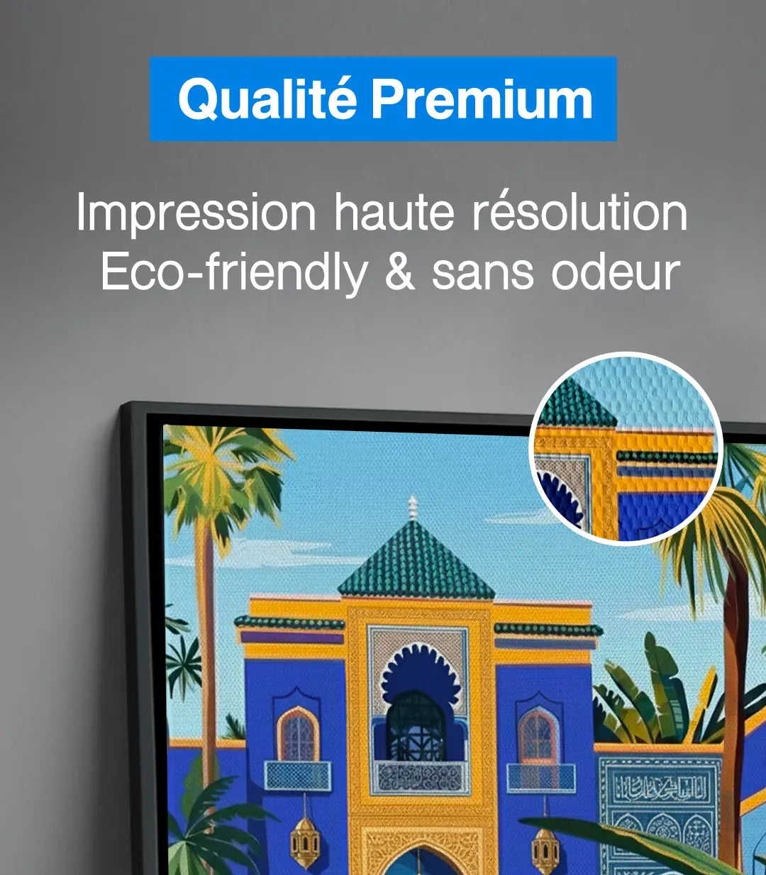 Découvrez nos tableaux exclusifs sur massinart.ma, alliant artisanat et modernité pour sublimer vos espaces. Chaque tableau est conçu à partir d’un châssis de 3 cm et d’une toile canvas artistique en coton (80 %), fabriquée en Allemagne. L’impression est réalisée en haute résolution avec des encres écologiques et sans odeur, garantissant une qualité exceptionnelle.