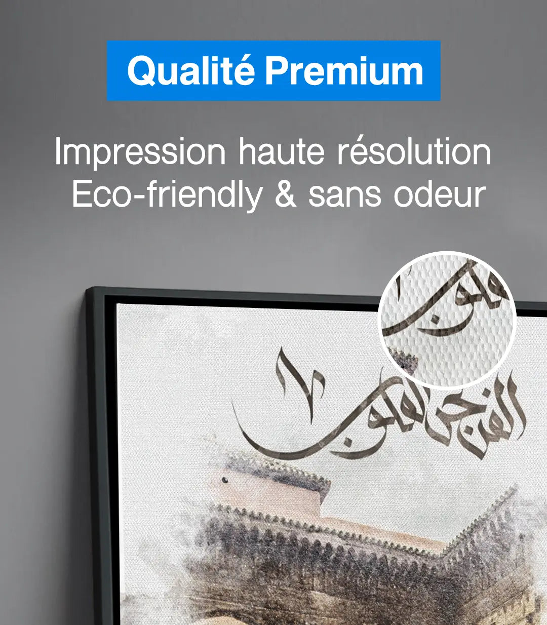 Découvrez nos tableaux exclusifs sur massinart.ma, alliant artisanat et modernité pour sublimer vos espaces. Chaque tableau est conçu à partir d’un châssis de 3 cm et d’une toile canvas artistique en coton (80 %), fabriquée en Allemagne. L’impression est réalisée en haute résolution avec des encres écologiques et sans odeur, garantissant une qualité exceptionnelle.